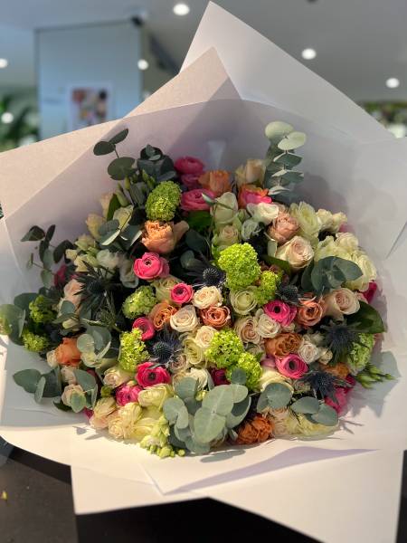 Nos bouquets composés mêlent harmonieusement différentes variétés de fleurs. Toujours élégants, ils sont conçus pour vous et adaptés selon vos goûts et vos besoins. Nos bouquets peuvent être champêtres, suivant les tendances actuelles, inspirées de la beauté naturelle des petites fleurs de champs. Nous savons aussi travailler les fleurs dans un style plus classique, plus sobre et structuré. Quelques soient vos préférences, nos fleuristes vous proposerons le bouquet adapté. Nous bénéficions d'un très large choix de fleurs : roses, lisianthus, lys, gypsophile, camomille, limonium, chardons, santini ou encore dahlias, hortensias, renoncules, anémones, tulipes et pivoines selon la saison. Il ne fait aucun doute que nous aurons de quoi trouver l'accord parfait !